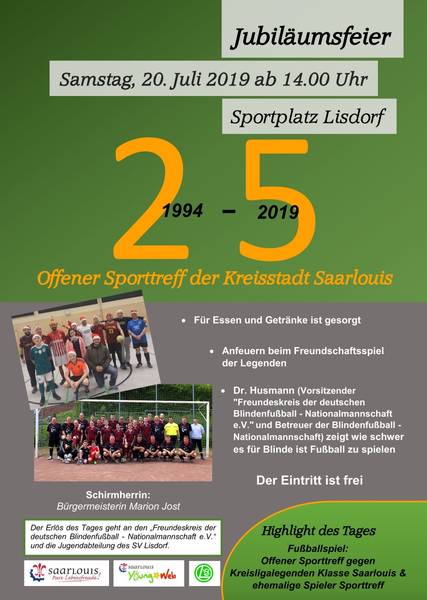 Highlight wird ein Legendenfußballspiel um 15.00 Uhr sein, bei dem ehemalige Größen gegen aktuelle Akteure des Offenen Sporttreffs gegeneinander antreten. Um zahlreiches Erscheinen und Anfeuern zum Freundschaftsspiel wird gebeten. An diesem Tag wird Hr. Husmann (Vorsitzender des "Freundeskreis der deutschen Blindenfußball-Nationalmannschaft“) zeigen, wie schwer es für Blinde ist Fußball zu spielen. Schirmherrin der Jubiläumsfeier ist die Bürgermeisterin der Kreisstadt Saarlouis, Marion Jost. Für das leibliche Wohl an diesem Tag ist gesorgt. Der Erlös des Tages geht an den "Freundeskreis der deutschen Blindenfußball-Nationalmannschaft e.V." und die Jugendabteilung des SV Lisdorf. Der Eintritt zum Jubiläumsfest ist frei.