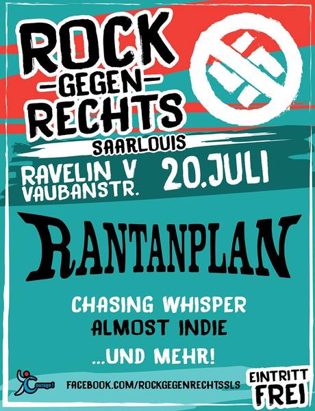 Infos: Das Rock gegen Rechts Saarlouis wird veranstaltet vom Netzwerk für Demokratie und Courage Saar in Zusammenarbeit mit vielen engagierten Partnern vor Ort: Juso Kreisverband Saarlouis, Falken Kreisverband Saarlouis, Linksjugend Saarland, IG-Metall Jugend, ver.di-Jugend, Landesjugendwerk der AWO Saarland, Landkreis Saarlouis, Kreisstadt Saarlouis, Saarländischer Integrationsbeirat.